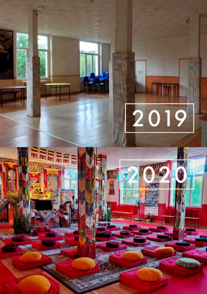 La salle de méditation du Centre est également la salle de classe pour les cours et les formations. Elle a été aménagée à partir de janvier 2020, 3 mois après l'acquisition du lieu. Vaste, spacieuse et lumineuse, elle est d'une superficie de plus de 100m² pouvant accueillir 150 personnes. Tous les éléments spirituels ajoutés ont été fabriqués sur mesure en Inde, au Népal et au Tibet. La statue du Bouddha Shakyamuni a été commandée par Lama Samten en Inde et a mis 2 ans pour être livrée. Elle est accompagnée des nouvelles statues des Bouddhas Manjushri et Maitreya.